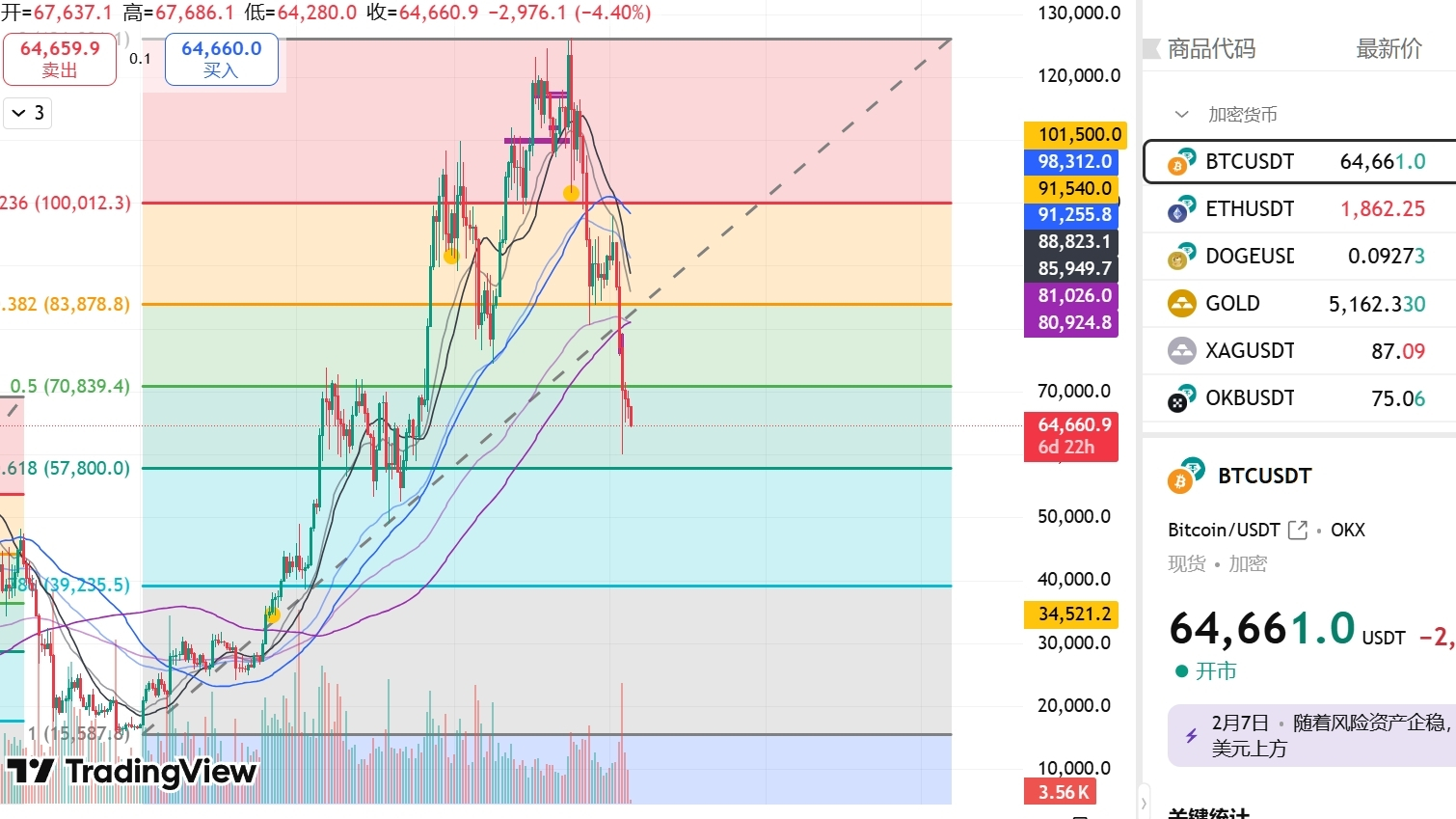 * 关键支撑: $62,000 - $63,000 区间。这是机构持仓的均线成本区,一旦失守,可能会回测 $58,000 的大本营。