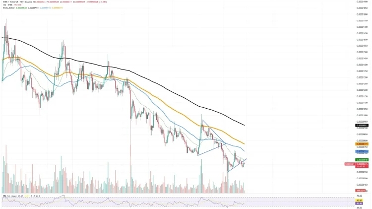 Para que lo entiendas mejor, piensa en el volumen como el combustible del cohete: aunque hubo un intento de mover unos 374 mil millones de SHIB para empujar el precio, la realidad es que no fue suficiente. Es como intentar organizar una fiesta increíble a la que apenas llega gente a bailar; falta fuerza. Y cuando hablamos de fuerza, el gráfico no miente: tenemos una alineación bajista de manual donde las medias de corto plazo están por debajo de las largas. Eso, sumado a un Índice de Fuerza Relativa (RSI) que se mantiene neutral, nos dice que el mercado está en modo espera, paralizado, y en este juego, esa indecisión suele terminar favoreciendo la tendencia que ya viene arrastrándose hacia abajo. 🛑