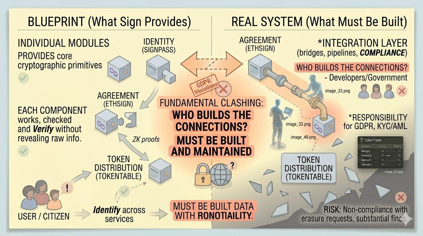 Ai đang cân nhắc dùng Sign cho sovereign deployment cần hỏi một câu trước khi ký hợp đồng: lớp kết nối giữa SignPass, EthSign, và TokenTable do ai xây và ai maintain? Nếu câu trả lời là "bạn tự làm," đó là thông tin quan trọng cần biết trước, không phải sau.