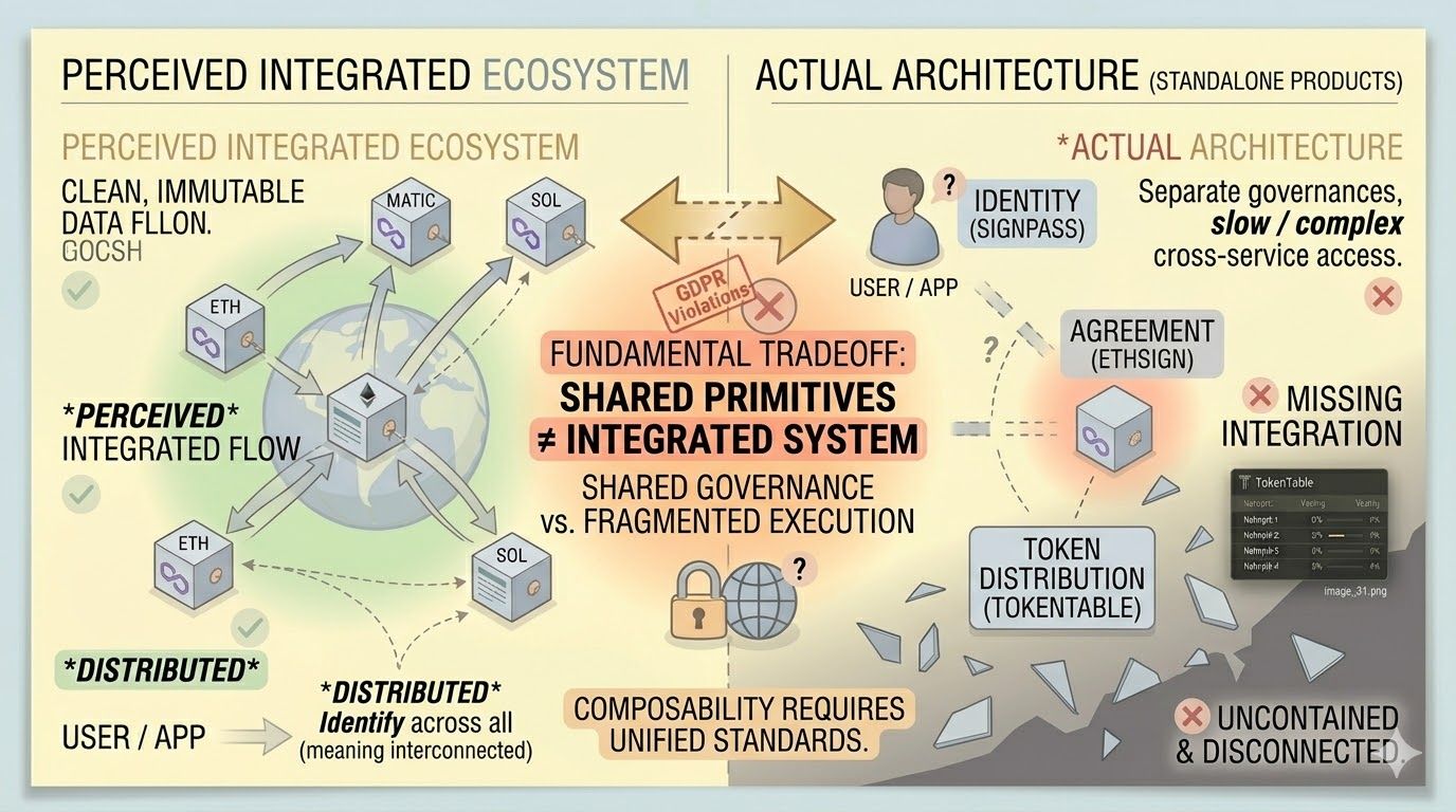 Đây là perceived composability gap: Sign marketing ba sản phẩm như một hệ sinh thái tích hợp thống nhất, nhưng ở tầng kiến trúc, chúng là ba sản phẩm riêng biệt dùng chung một số building blocks nền tảng.