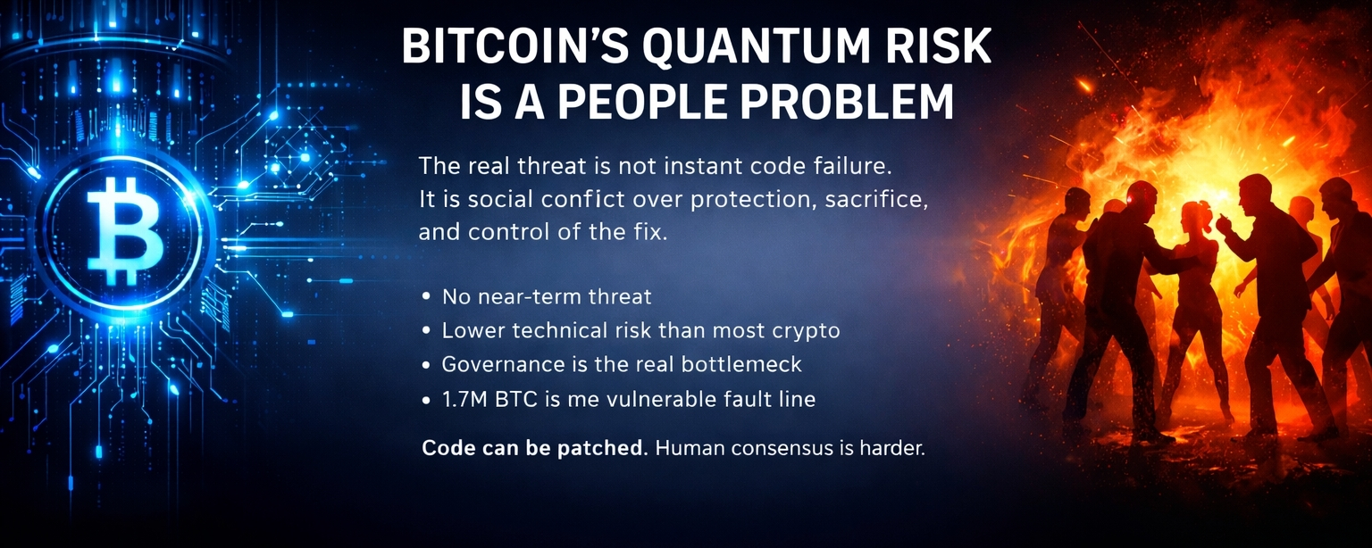 So I do not read this as a near-term doom call. I read it as a stress test of whether Bitcoin can act early, while the threat is still abstract, and solve a problem that hits money, myth, and power all at once. If it can, that is strength. If it cannot, then the quantum risk was never just about machines. It was about whether the social layer is mature enough to protect the asset before panic makes the choice for it.