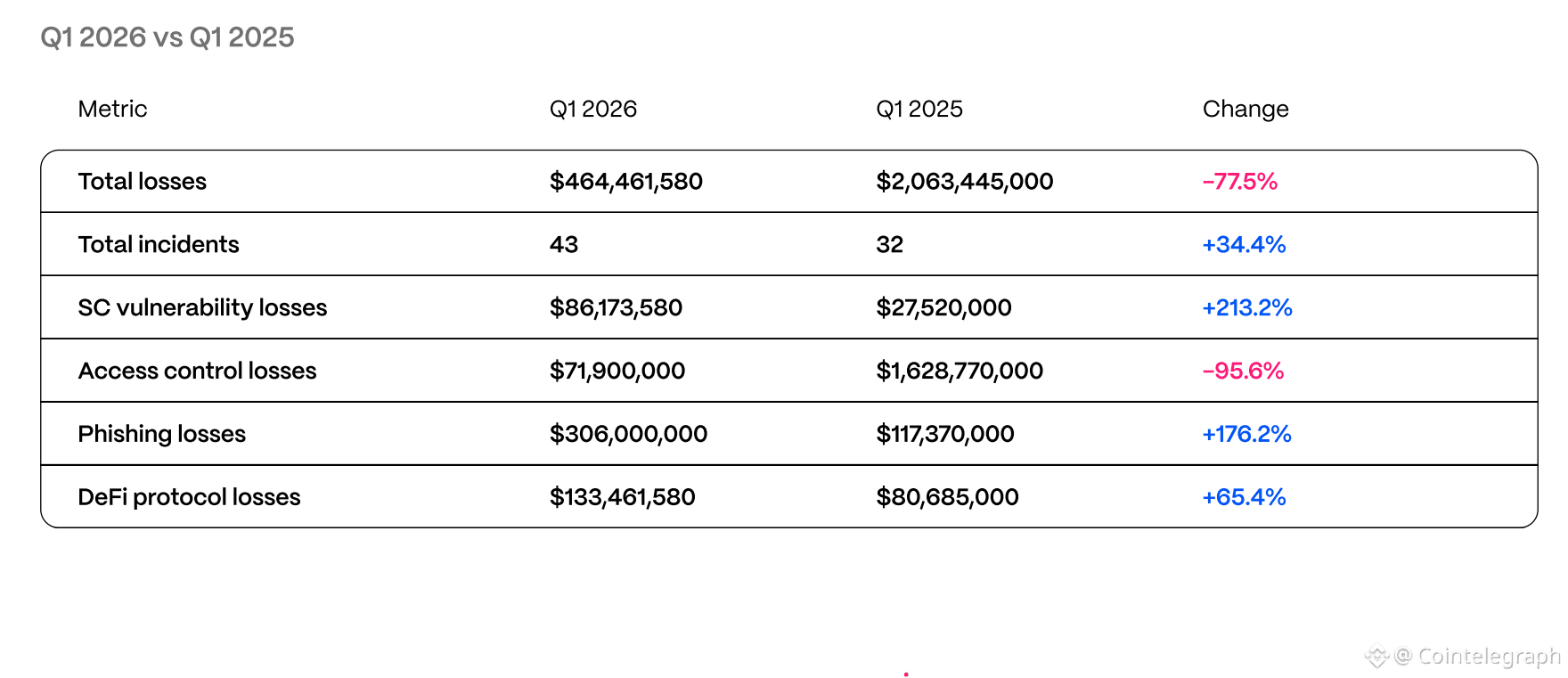 The losses place this quarter as the second-lowest first quarter since 2023, with the absence of a single mega hack on the scale of Bybit, which lost $1.46 billion in Q1 2025, the primary driver of the year-over-year decline.