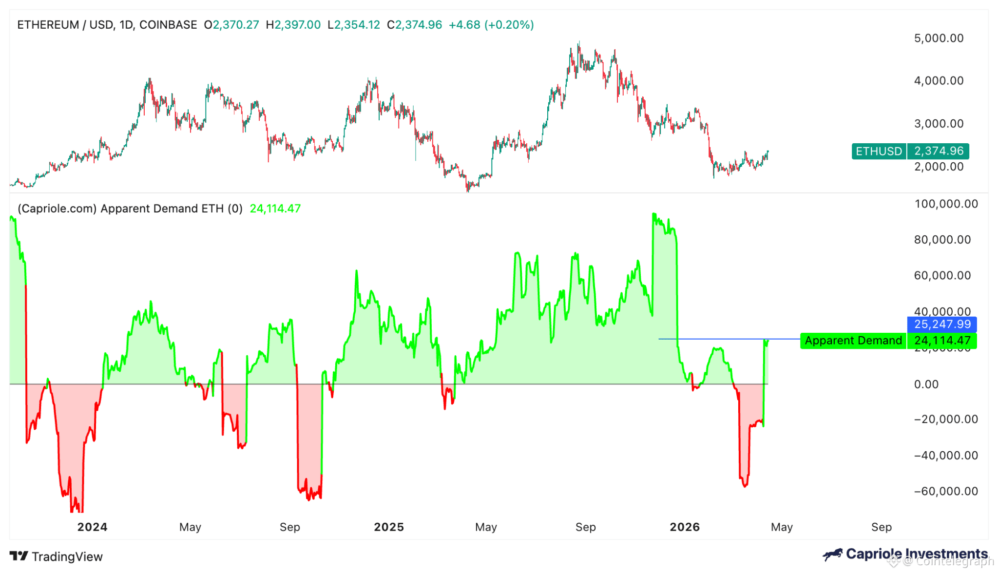 Capriole Investment’s Ethereum Apparent Demand metric reveals that the demand for Ether has been positive since April 8, rising to a high of 24,111 ETH on April 14.