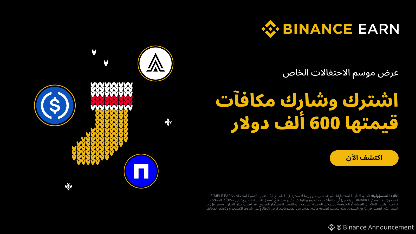 كجزء من تقويم عيد الميلاد #MerryBinance لهذا العام، يسر Binance Earn أن تقدم أربعة أنشطة لمنتجات Simple Earn المرنة والثابتة وBFUSD وDual Investment. من خلال المشاركة في هذه الأنشطة، يمكن للمستخدمين المؤهلين مشاركة مكافآت بقيمة 600,000 دولار والاستمتاع بمكافآت APR تصل إلى 29.9%.
