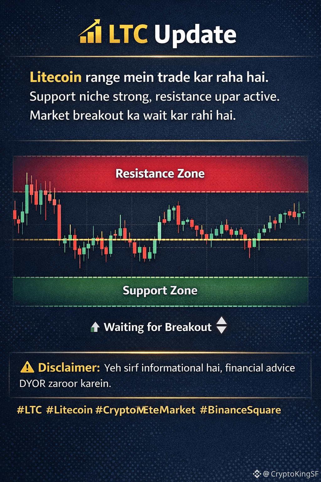 Litecoin ($LTC ) ne recent sessions mein stable movement dikhaya hai, jahan price ek clear range ke andar trade kar raha hai. Market sentiment neutral se slightly cautious lag raha hai, jo overall crypto market ke trend ko follow kar raha hai.