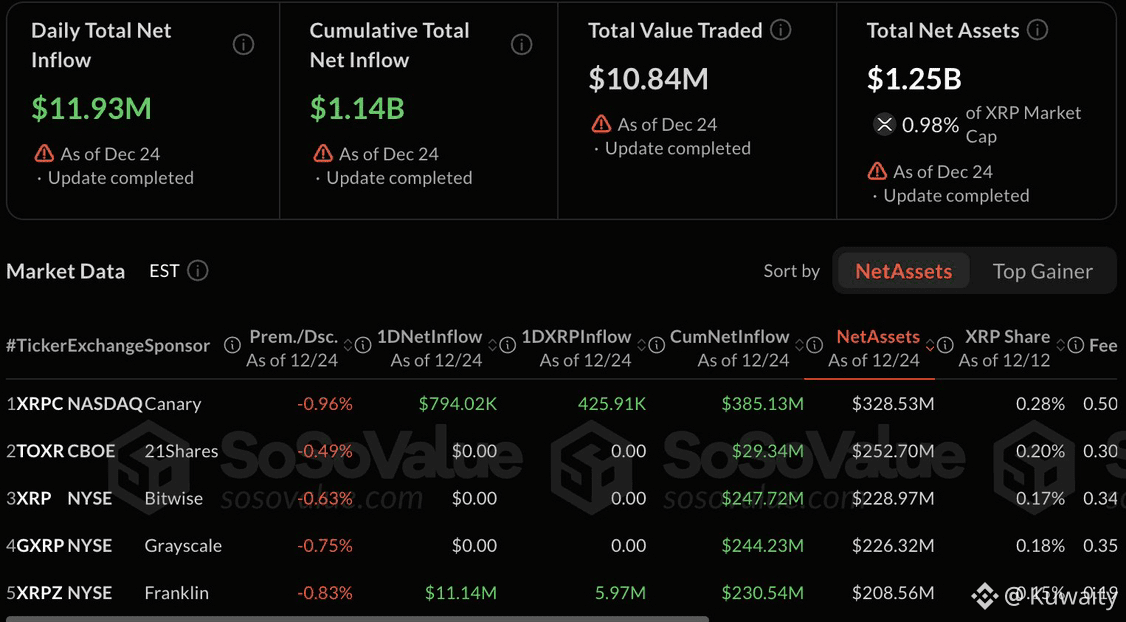 في الخلفية، استمر النشاط على شبكة ريبل بوتيرة قوية. عالجت الشبكة معاملات تُقدَّر بنحو 95 مليار دولار هذا العام. هذا الرقم عزز المزاعم بأن $XRP يؤدي دورًا فعليًا في المدفوعات العابرة للحدود. كما حصلت ريبل على استثمار بقيمة 500 مليون دولار. ووفقًا للتقارير، قيّم هذا الاتفاق الشركة بنحو 40 مليار دولار. المؤيدون يرون أن ذلك يعزز الأسس طويلة الأجل لـXRP. في الوقت نفسه، ارتفع الاهتمام المؤسسي. سجل صندوق Canary Capital XRPC ETF تدفقات قياسية منذ إطلاقه. وبلغت إجمالي التدفقات إلى صناديق ETF المرتبطة بـXRP نحو 1.14 مليار دولار خلال شهر واحد فقط، بحسب بيانات السوق. ودخلت شركات مثل Canary Capital وGrayscale وBitwise وFranklin هذا المجال.