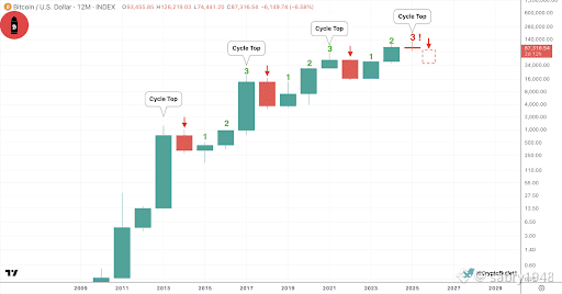 على مر السنين، كان سعر البيتكوين يتبع نمطاً متكرراً في الشموع السنوية: ثلاث شموع خضراء متتالية غالباً ما تتبعها شمعة حمراء. هذا التسلسل ظهر مرات عديدة منذ عام 2011، مما جعل الكثير من المتداولين يتوقعون تكراره في الدورة الحالية. لكن هذه المرة اختلفت الأمور؛ فبينما أغلق كل من عامي 2023 و2024 باللون الأخضر، يتجه عام 2025 نحو الإغلاق بالأحمر، مما يقطع هذا النمط التقليدي.