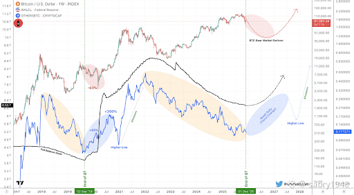 بناءً على هذا السيناريو، يتوقع CryptoBullet حدوث انتعاش ميت (Dead Cat Bounce) في بداية عام 2026، مصحوباً بانتقال مؤقت وقصير الأجل نحو العملات البديلة، قبل أن يبدأ تصحيح أعمق بكثير يشمل البيتكوين مع تقدم مرحلة الهبوط.