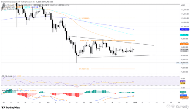 يتداول البيتكوين فوق 88000 دولار، موسعًا حركة جانبية ضمن نمط مثلث متماثل بعد ارتفاع بنسبة %1.43 يوم الثلاثاء.