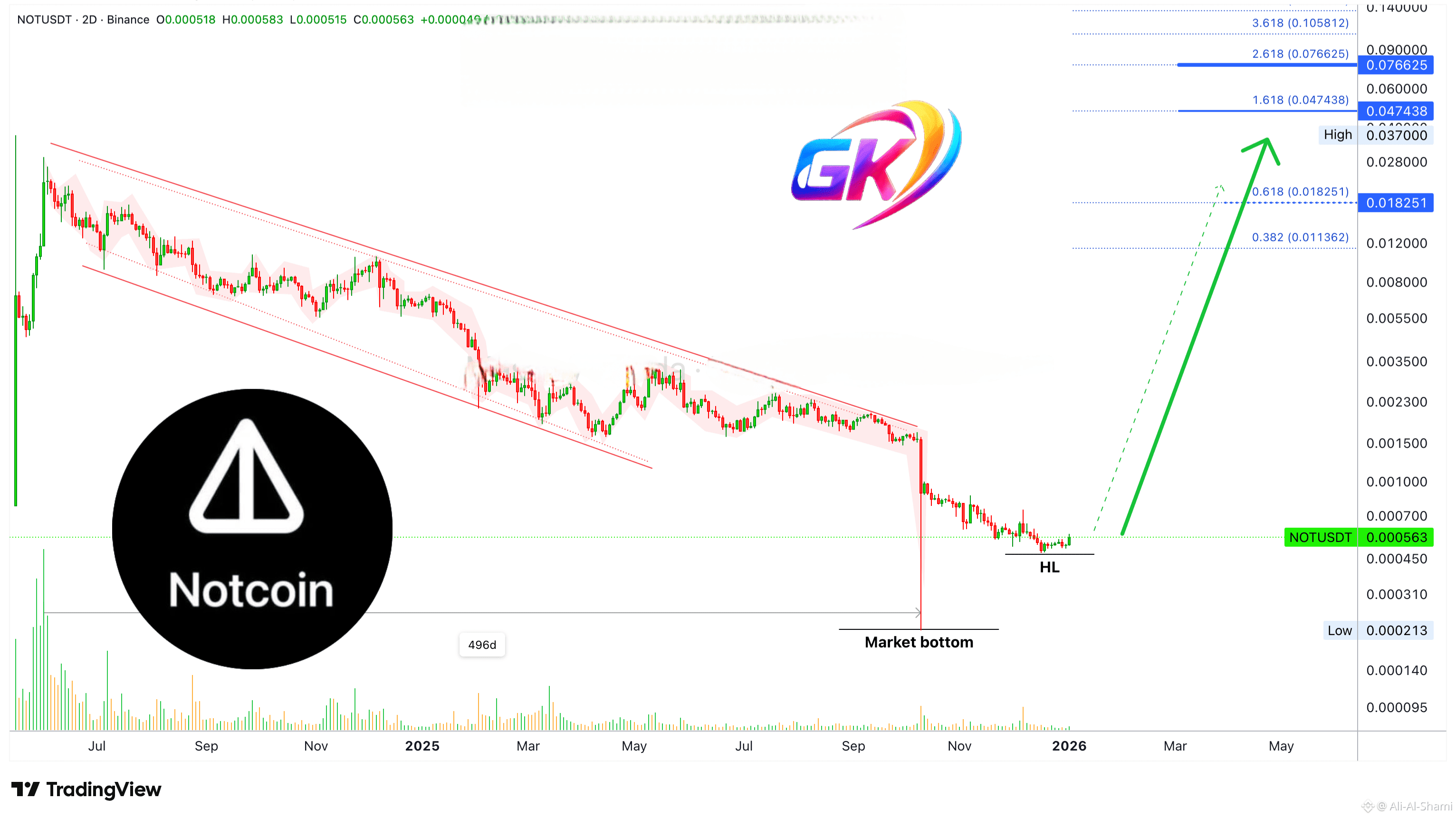 القاع موجود، 10-أكتوبر 2025: يبدأ نوتكوين في ارتفاع كبير، دورة صعودية قوية. القاع الأعلى موجود في 18-ديسمبر 2025. هذا هو. يمكن لنوتكوين الآن أن ينمو، مباشرة إلى الأعلى، قمم أعلى وأدنى من القيعان لأكثر من عام كامل - يمكن أن يكون أكثر.