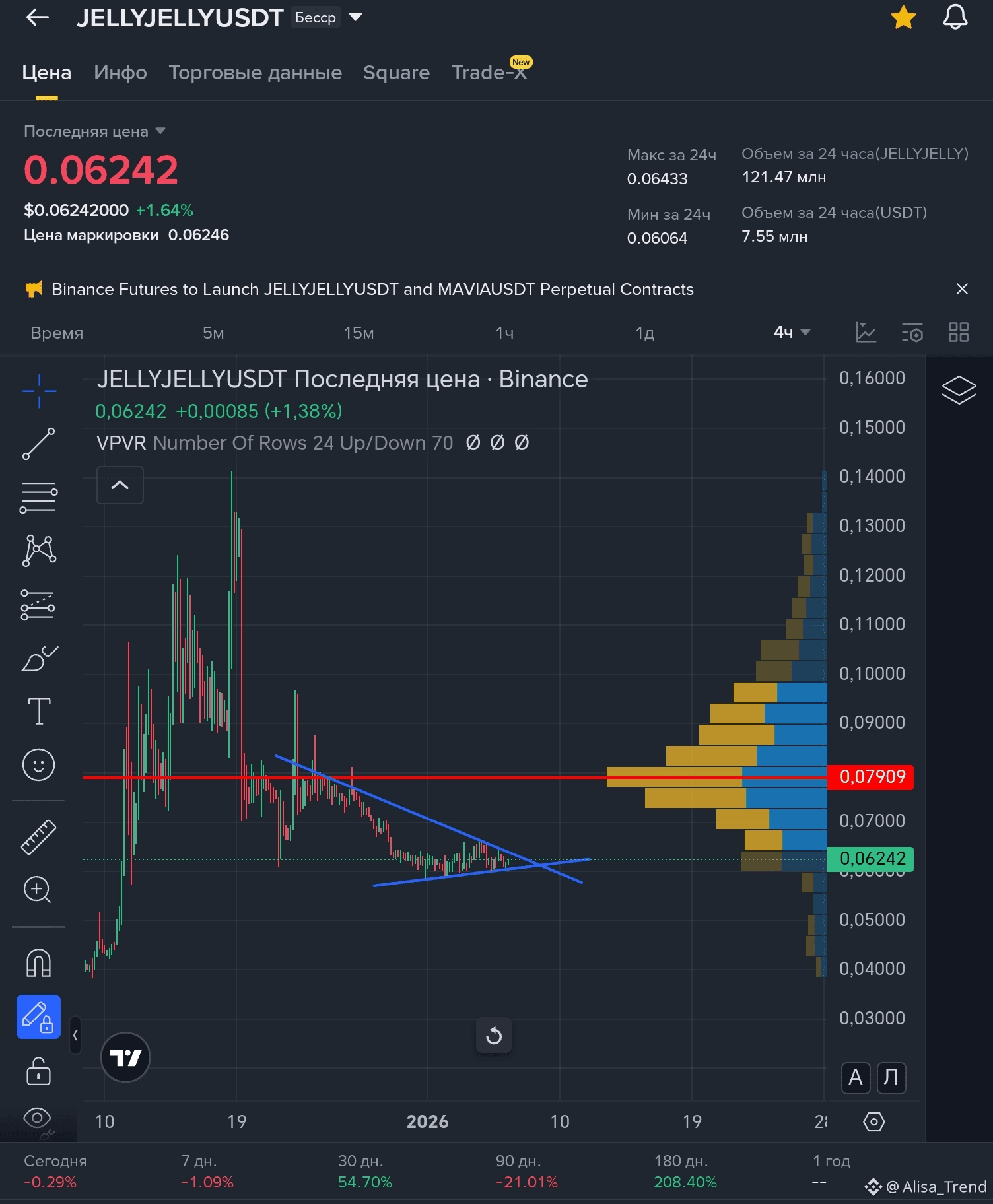 На дневном графике $JELLYJELLY отчетливое «сжатие». Прямо сейчас монета нащупала мощную поддержку на 0.05921, и это наш главный рубеж. 🛡️
