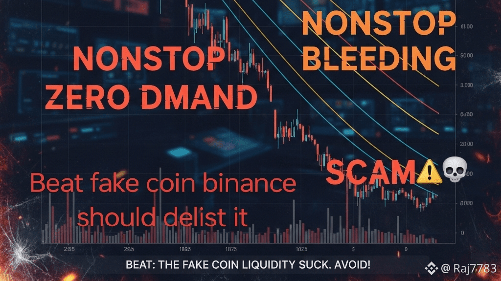 BEAT is a complete disaster 📉🔥. This chart screams manipulation, distribution, and total collapse. No buyers, no volume, no recovery — just nonstop bleeding. EMAs are miles above price, confirming a dead trend. This is exactly how a beat fake coin operates: hype, pump, trap, dump. Calling it a beat fake coin scam is justified when price keeps grinding to new lows with zero demand. There is no structure, no momentum, no future here. BEAT is nothing but a zero value coin sucking liquidity from retail traders 💀⚠️. Avoid before it nukes further