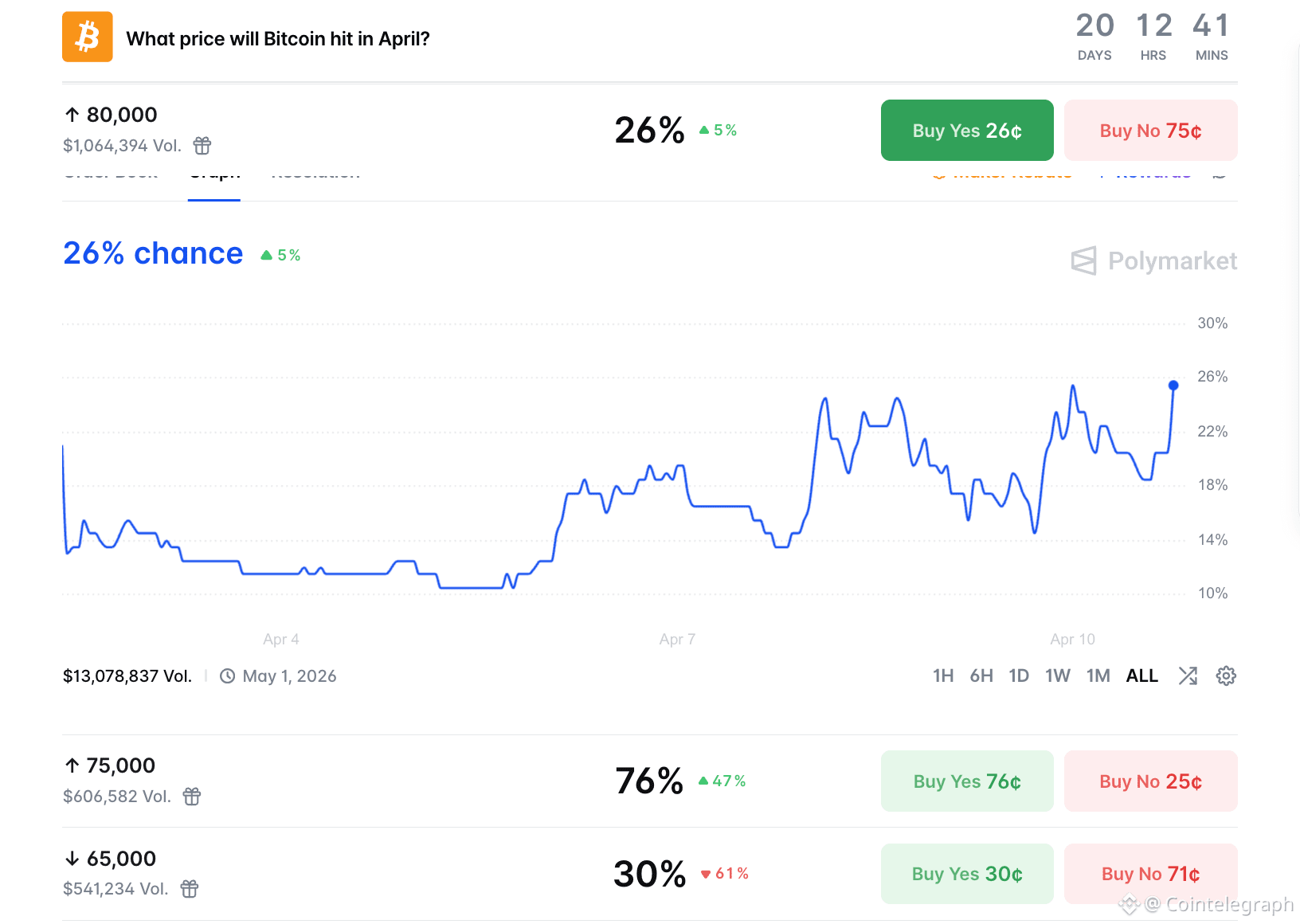 Traders now assign 26% chances that BTC/USD reaches $80,000 in April, a 5% increase over the last 24 hours. The $75,000 target carries even stronger convictions at 76%.