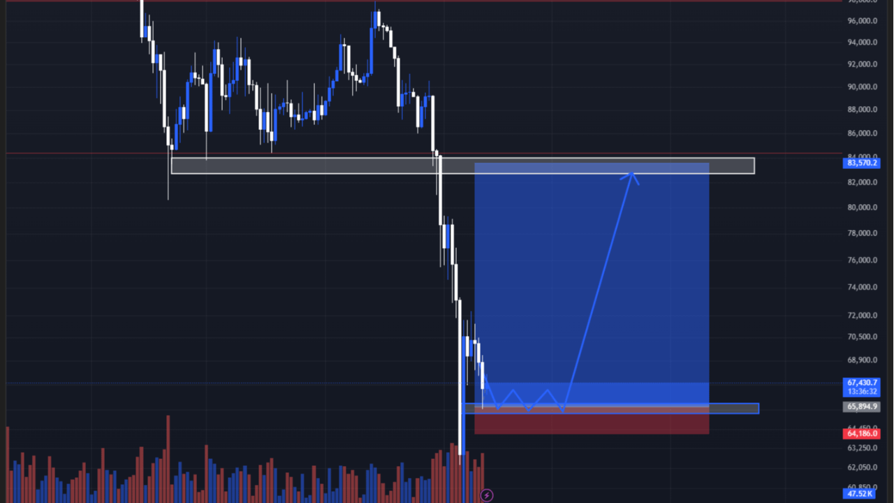 Der Plan war einfach: Lassen Sie die Panik sich selbst erschöpfen, warten Sie, bis der Preis in die Nachfragezone von 65–66K eintaucht, und positionieren Sie sich dort.