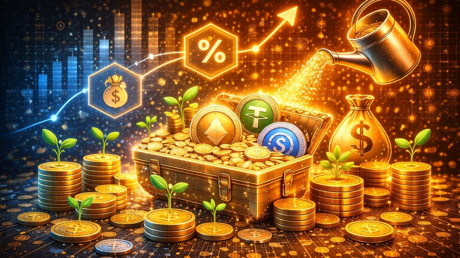 Yield Farming je strategie v DeFi, kde uzamykáš kryptoměny a získáváš za to odměny.