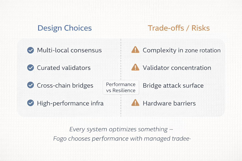Fogo versucht, schnelle Ausführung, Zusammenarbeit mit anderen Ketten, Benutzerfreundlichkeit und intelligente Vorteile in Einklang zu bringen. Die Hauptteilnehmer, Investoren und Benutzer arbeiten aufgrund seiner Regeln und des Tokensystems zusammen. Echte Teilnahme wird durch Airdrops und Treuebelohnungen belohnt und das offene Gespräch über die Risiken ist ein gutes Beispiel. Dennoch gibt es Hindernisse. Es wird dadurch kompliziert, dass das System in einer Vielzahl von lokalen Ketten verwendet wird. Brücken sind immer riskant. Das System der ausgewählten Validatoren kann den Grad der Dezentralisierung des Netzwerks einschränken. Es bleibt abzuwarten, ob Fogo auch in Zukunft weiterhin liefern wird, wenn mehr Personen es nutzen oder wenn das Volumen der Cross-Chain-Aktivitäten zunimmt.