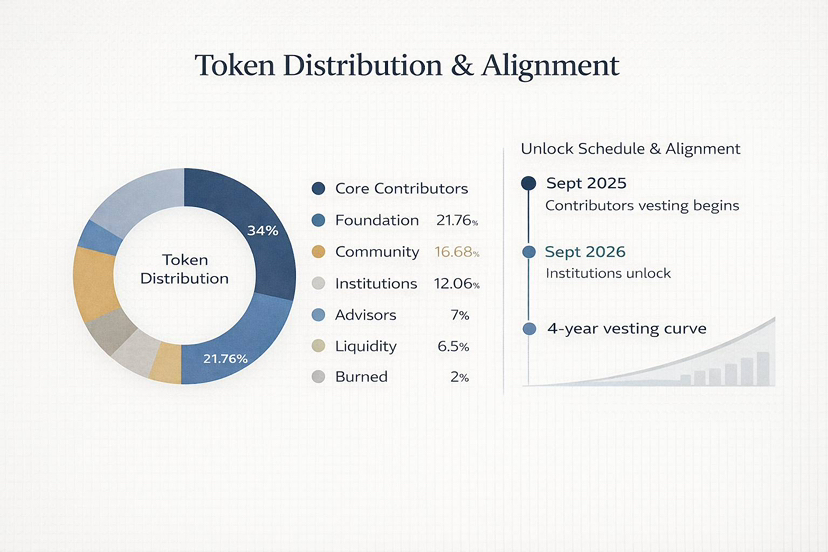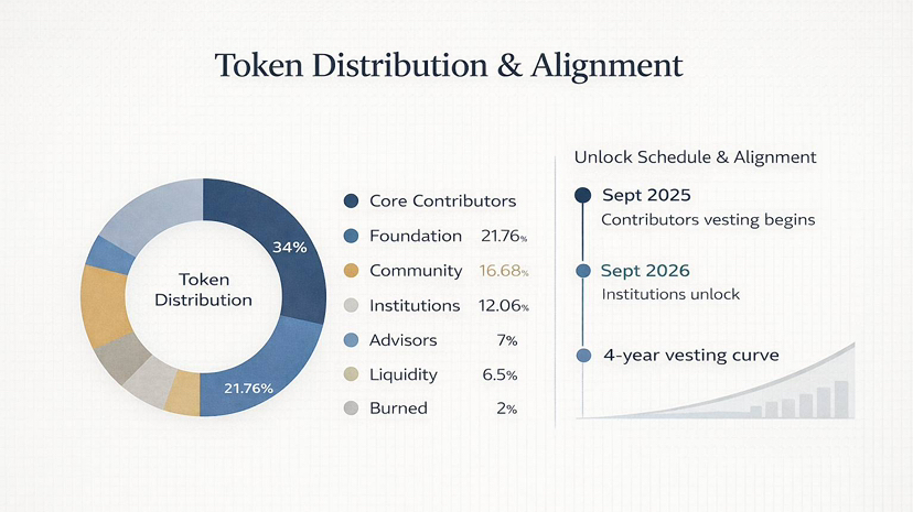 Das Angebot an Tokens ist der Beginn jeder Diskussion über Anreize. In den Tokenomics-Dokumenten weist Fogo 34 % der Tokens den Hauptbeitragsleistenden zu, 21,76 % dem Ökosystemfonds, 16,68 % der Gemeinschaft (Verkäufe und Airdrops), 12,06 % den institutionellen Investoren, 7 % den Beratern, 6,5 % der Startliquidität und 2 % verbrannt. Die Prozentsätze sind nicht alles, was wichtig ist, sondern die Freigabepläne. Tokens der Hauptbeitragsleistenden werden bei der Einführung gesperrt und beginnen nach September 2025, mit einer einjährigen Klippe, zu vesten. Die institutionellen Investoren werden im September 2026 freigegeben, und die überwiegende Mehrheit der Gemeinschaftstokens wird länger vesten. Während der anfänglichen Einführung ist das Angebot auf 63,74 % gebunden, und der Druck lässt sich über einen Zeitraum von vier Jahren verringern.