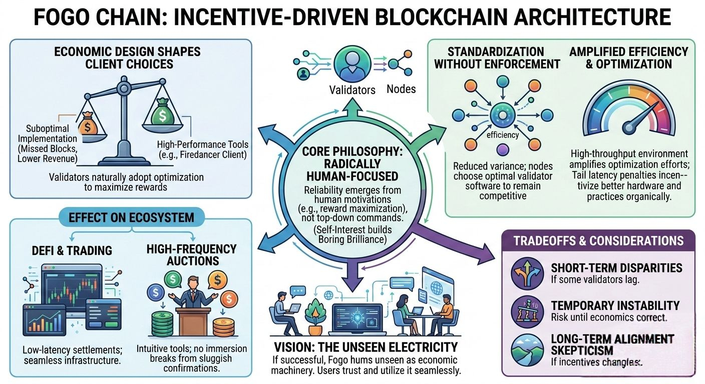 Die meisten Blockchains erzwingen das Verhalten von Clients durch rigide Protokollregeln und micromanagen jeden Knoten, um Einheitlichkeit sicherzustellen. Fogo Chain fühlt sich so an, als wolle es einen Schritt zurücktreten und wirtschaftliche Anreize leise die Effizienz lenken lassen und einen vorhersehbaren Rhythmus erzeugen, in dem Validierer aus Eigeninteresse Optimierung wählen, nicht per Dekret.