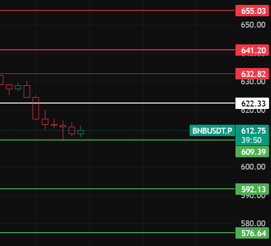 如果夜间反弹上不去622上方,那说明反弹没有力度,继续下跌下方支撑位留意609-592-576这几个位置附近!#BNB走势