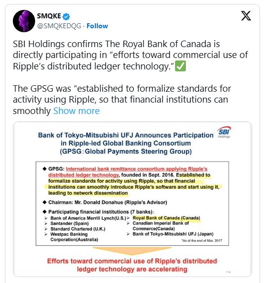 Der Beitrag hebt die Bestätigung von SBI Holdings hervor, dass die Royal Bank of Canada direkt an den Bemühungen teilgenommen hat, die kommerzielle Nutzung der verteilten Ledger-Technologie von Ripple zu ermöglichen.