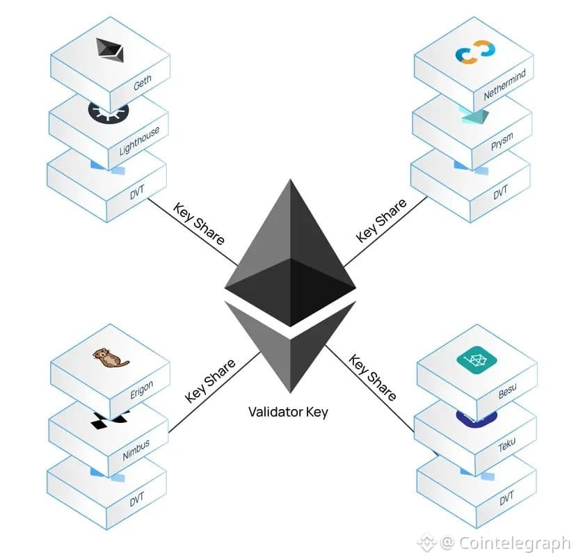 In regular solo staking, everything is run on one computer, which can result in “slashing” or penalties if it crashes, gets hacked, or loses internet. Full DVT splits the secret keys across many computers that constantly communicate, which is very secure, but complicated to set up.