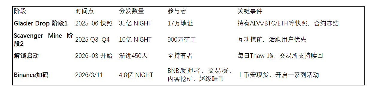 Um die Markstabilität zu gewährleisten und zu vermeiden, dass Token auf einmal in den Markt strömen und ein Risiko für einen Preisverfall verursachen, wird der Glacier Drop Airdrop in zwei Phasen geordnet vorangetrieben, wobei alle verteilten Token mit einem 450-tägigen schrittweisen „Thaw“ (Schmelzen) Freischaltmechanismus ausgestattet sind, um den Wert der Token stabil freizugeben. Zugleich haben führende Börsen wie Binance, Kraken und OKX an diesem Airdrop-Verteilungsprogramm teilgenommen und zusätzlich 480 Millionen NIGHT-Token bereitgestellt, die speziell an BNB-Token-Inhaber verteilt werden, damit mehr Nutzer von diesem Vorteil profitieren können.