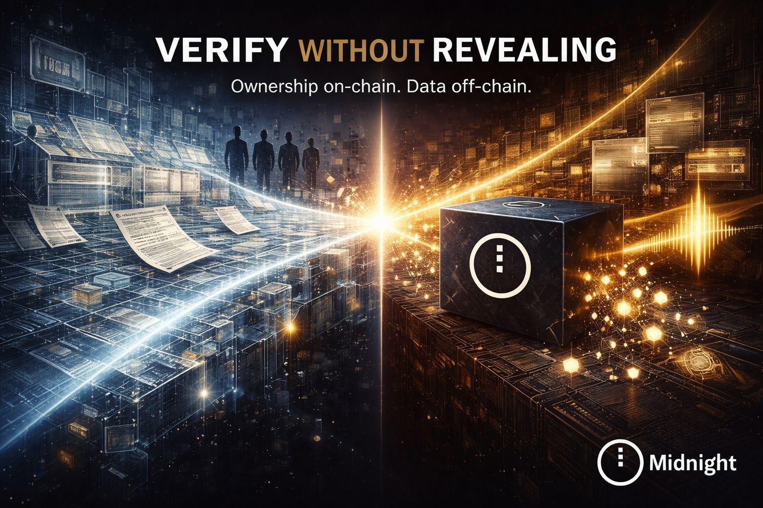 Midnight đi theo hướng ngược lại. Không phải cố che toàn bộ như privacy chain cũ. Mà tách quyền xác minh ra khỏi dữ liệu gốc. Quyền sở hữu vẫn on-chain. Dữ liệu nằm ở phía người dùng. Blockchain chỉ giữ ZK proof xác nhận mọi thứ hợp lệ, không cần biết nội dung.