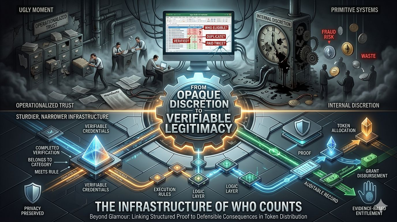 Das ist der Punkt, an dem dieses Thema aufhört, wie eine Krypto-Nische zu klingen, und beginnt, wie Infrastruktur zu klingen. Denn das eigentliche Problem sind nicht Tokens. Tokens sind lediglich das sichtbare Objekt, das bewegt wird. Das tiefere Problem ist, ob ein System Beweise mit Ansprüchen verbinden kann, ohne in Ermessensspielräume zu kollabieren. Kann es zeigen, warum eine Person qualifiziert war und eine andere nicht? Kann es diese Logik nachträglich bewahren? Kann es Wert festlegen, ohne eine Spur voller Lücken, Ausnahmen und unausgesprochener Anpassungen zu hinterlassen? Das sind keine glamourösen Fragen. Sie sind administrative Fragen. Genau deshalb sind sie wichtig.