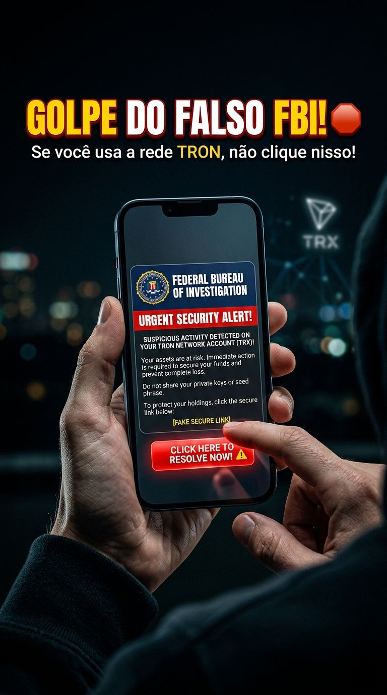 Atenção usuários da rede Tron! O FBI emitiu um alerta real sobre um token falso que usa o nome da instituição. O golpe diz que sua carteira está sob investigação e pede seus dados para evitar um bloqueio. É cilada! O objetivo é roubar seus ativos. Se ver algo do "FBI" na sua carteira Tron, ignore e proteja suas chaves! 🛡️🚫