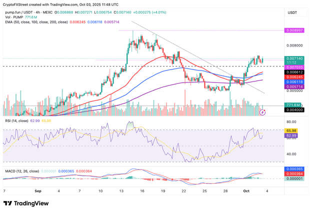 Pump.fun ($PUMP ) Im Falle eines Anstiegs am Freitag handelt er über dem kritischen Niveau von 0,0070 Dollar, unbeeinflusst von den leichten Preisbereinigungen bei Bitcoin (BTC) und Ethereum (ETH). Das Token, das mit der führenden Meme-Token-Launch-Plattform auf Solana verbunden ist, zeigt kurzfristige bullische Signale, unterstützt von wichtigen technischen Indikatoren.