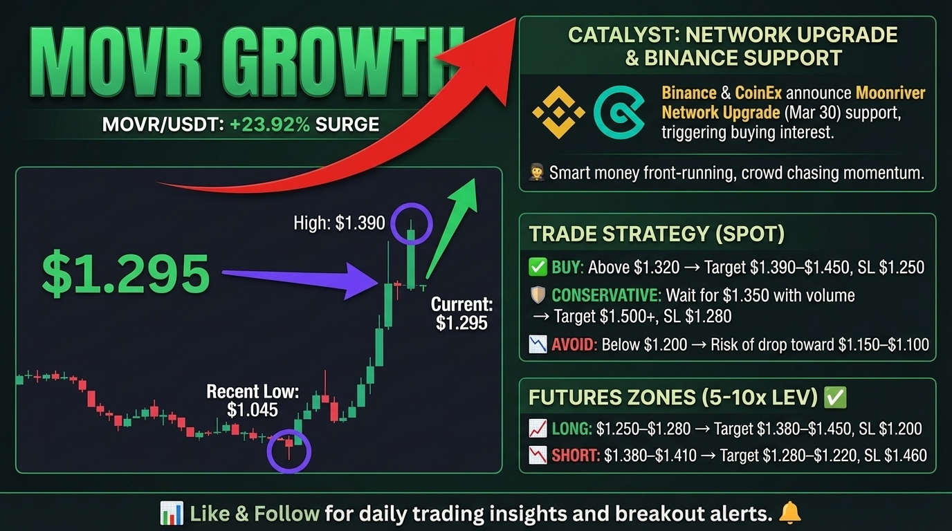 $MOVR just ripped from $1.045 to $1.390 in hours, now trading at $1.295 with a solid +23.92% gain. Volume hit 2.36M MOVR with $2.94M USDT changing hands. The catalyst? Binance and other major exchanges announced support for Moonriver's upcoming network upgrade on March 30, triggering fresh buying interest. Smart money is frontârunning the upgrade narrative. The crowd is chasing momentum. đ