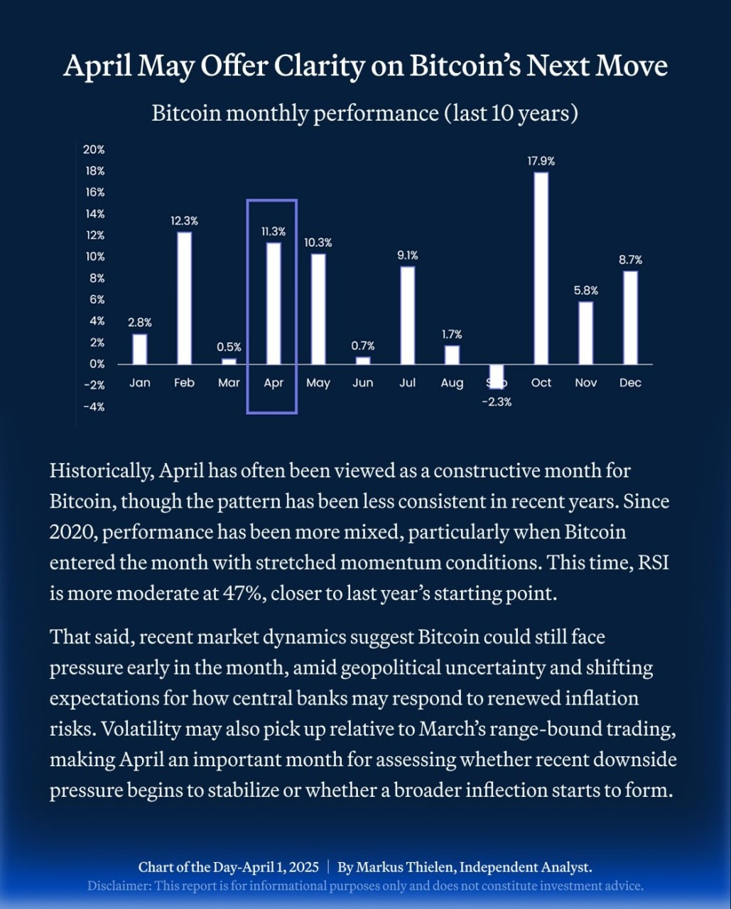 1. Импульс не перегрет. RSI около 47% - это "умеренная" зона, ближе к более здоровому старту месяца, чем когда рынок заходил в апрель уже на растянутом движении. Логика простая: меньше перегрева - меньше риск, что месяц начнется с обязательного "сброса пара".