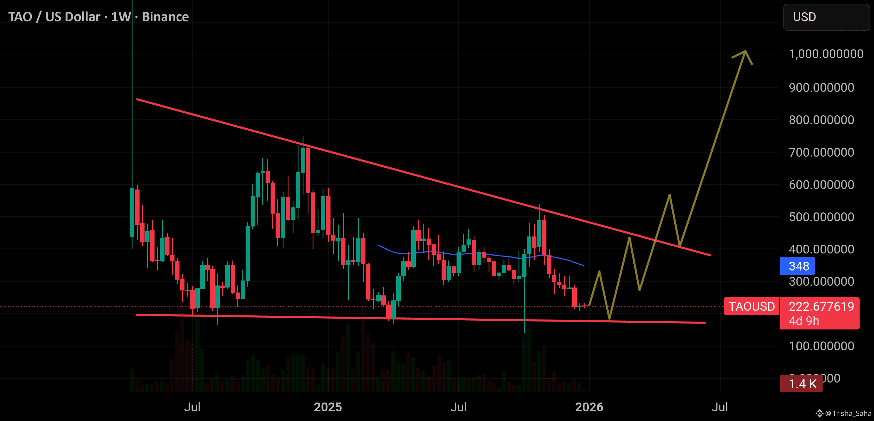 From a price action perspective, TAO is currently trading near a major long term support zone. If price holds the $180 to $170 area and delivers a clear bounce, followed by a decisive breakout above the descending trendline, the structure opens room for a potential 100 percent to 1000 percent upside over the next cycle. The $160 level remains key support, and a clean loss of this level would invalidate the bullish thesis.