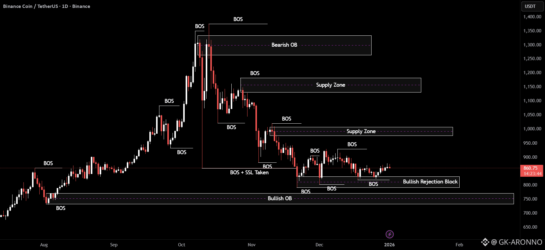 As you can see in the Daily chart of BNBUSDT, after hitting a new ATH at $1375 in October, it has plummeted in price and is being traded now at $860.