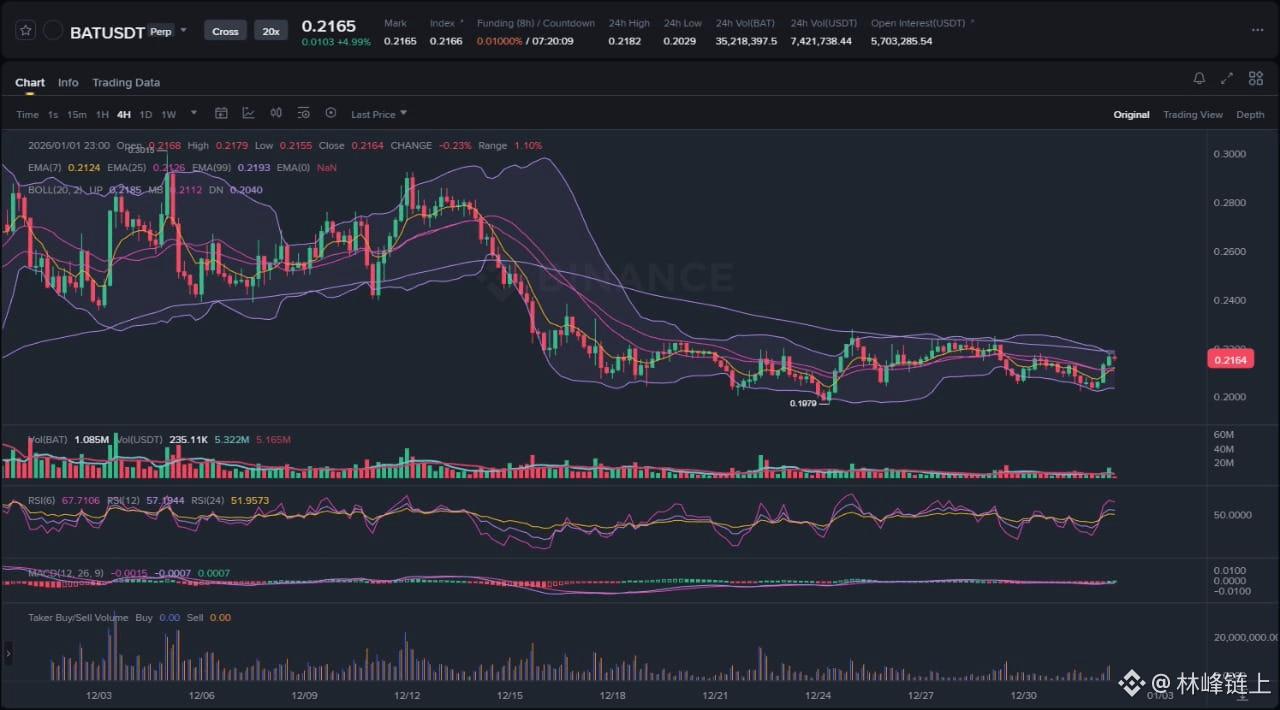 The 4-hour chart for BATUSDT reveals a market in a clear consolidation phase following a significant impulsive move downwards in mid-December. Three elements are particularly noteworthy. First, the Bollinger Bands have contracted significantly, indicating a severe drop in volatility. This "squeeze" is a primary indicator that the market is preparing for a new directional leg. Second, a clear horizontal range has formed, with support established near the 0.1979 low and resistance capping advances around the upper Bollinger Band. Third, price action is exhibiting mean reversion, oscillating tightly around the 20-period moving average. The overall technical bias is neutral, awaiting a decisive break from this established range. The structure suggests an accumulation or distribution pattern is completing, and the resolution of this pattern will dictate the short-to-medium term bias.