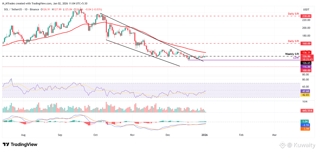 إذا استمر مستوى 126.65 دولار الأسبوعي كدعم، فقد يمتد SOL في الارتفاع نحو المقاومة اليومية التالية عند 160 دولار.