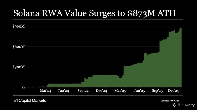 تظهر البيانات على السلسلة أن نظام سولانا البيئي للأصول الحقيقية (RWA) وصل إلى أعلى مستوياته على الإطلاق عند 873 مليون دولار، مما يبرز تزايد اعتماد الشبكة.