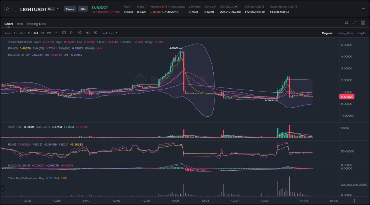 Das LIGHT-Diagramm auf einem 4-Stunden-Zeitrahmen zeigt ein mehrwöchiges Konsolidierungsmuster nach einem impulsiven Anstieg von lokalen Schwungtiefs Anfang Oktober. Der Preis hat einen sich verengenden Bereich gebildet, gekennzeichnet durch niedrigere Hochs und eine Reihe von Ablehnungen an der oberen Grenze nahe dem jüngsten Schwunghoch, was auf nachlassende Dynamik hindeutet. Die Volatilität hat sich bemerkenswert verringert, wie die sich verengenden Bollinger-Bänder und eine Abflachung des oberen Hüllkurvenbereichs zeigen, während die Oszillatoren im niedrigeren Zeitrahmen auf ein Potenzial zur Mittelwertumkehr hindeuten. Das Volumenprofil zeigt eine dünner werdende Teilnahme an Aufwärtsbewegungen, mit Liquiditätstaschen, die unterhalb des Bereichs-Mittelpunkts aufgebaut werden, was auf einen möglichen Akkumulations- oder Verteilungsstillstand hindeutet. Insgesamt neigt die Struktur nach dem vorherigen Aufwärtstrend zu einem marktgebundenen Bereich, wobei noch kein bestätigter Ausbruchversuch sichtbar ist.