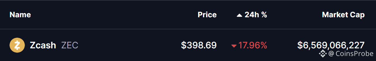 As of writing, 2026, ZEC is currently trading around $398, marking a steep decline of nearly 18% in the past 24 hours. The drop wiped out much of the recent rally momentum, with the coin dipping below key psychological levels like $400 amid spiking volume and fear.