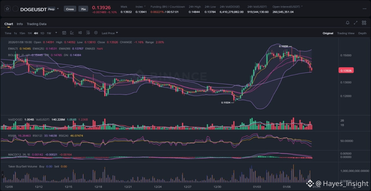 Examining the chart, DOGE's price structure reveals an uptrend attempt following a prolonged range-bound phase earlier in the period. The candlestick formations show an impulsive bullish move breaking above the recent range top at approximately $0.1400, characterized by widening volatility bands and a rejection of lower Bollinger Band support. Key observable elements include a clear local swing high at $0.1580, where initial profit-taking led to minor pullback, and a consolidation pattern forming as green candles cluster around the midline of the Bollinger Bands, indicating balanced momentum without immediate overextension.