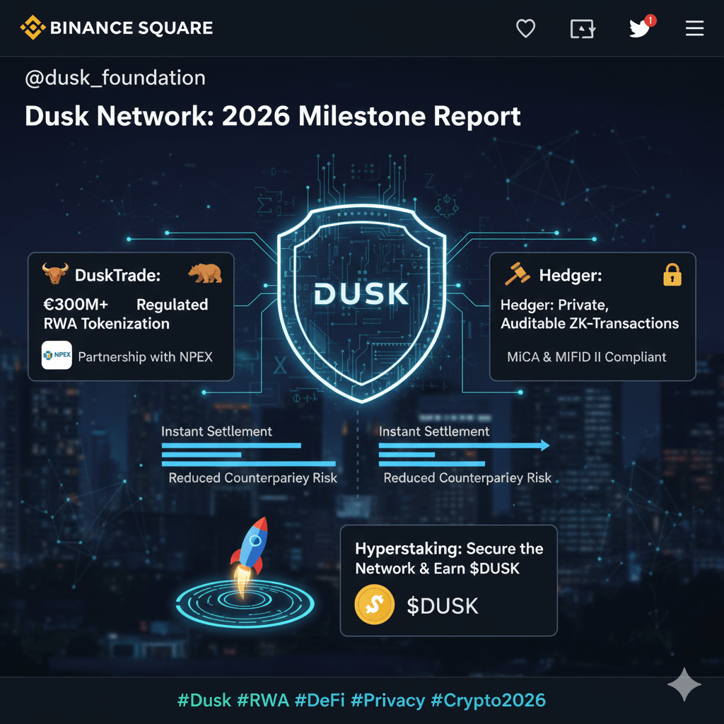 Eine der spannendsten Entwicklungen für $DUSK in 2026 ist die wachsende Akzeptanz von DuskTrade. Durch Partnerschaften mit lizenzierten europäischen Börsen wie NPEX ermöglicht Dusk die on-chain-Übertragung von über 300 Millionen Euro an regulierten Wertpapieren. Dies ist kein Testfall – es ist ein funktionierender Zugang für Anleihen, Aktien und Private-Credit, die mit nahezu sofortiger Endgültigkeit ($T+0$) gehandelt werden können, ein gewaltiger Sprung gegenüber den traditionellen $T+2$-Settlement-Zyklen.