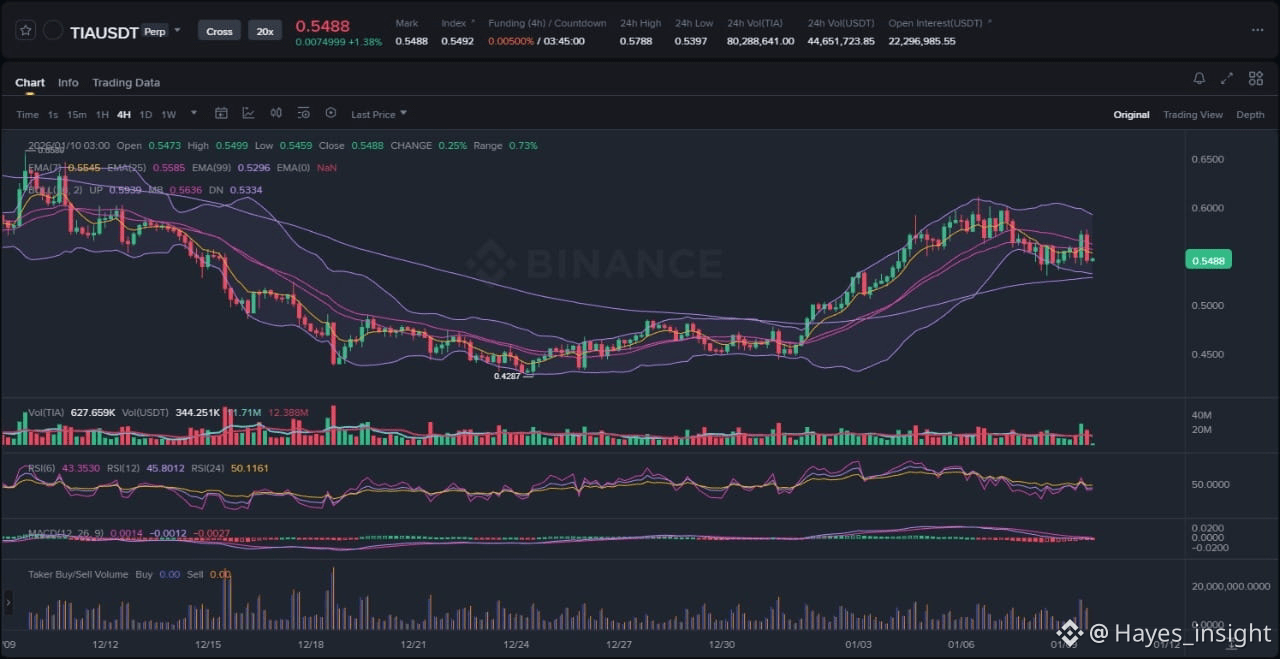 Practical takeaways include monitoring volume behavior for spikes above 1.5x average (currently 250 million TIA daily) at the $4.52 support, as sustained buying could signal institutional accumulation; watch for reaction at the Bollinger middle band $5.05, where a clean close above would hint at mean reversion; and track momentum via RSI divergence—if price makes new lows but RSI holds above 25, it may foreshadow a probabilistic uptick. Additionally, observe liquidity sweeps in the $4.40-$4.60 zone, where stop-loss clusters from leveraged positions could fuel volatility.