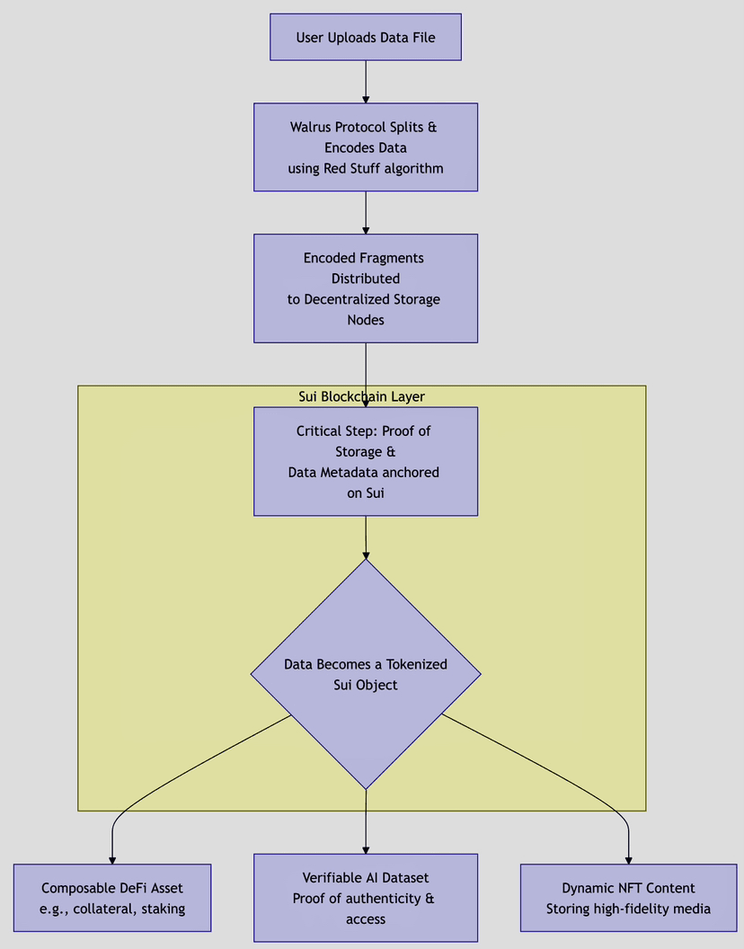 Um zu visualisieren, wie Walrus die Architektur von Sui nutzt, betrachten Sie den folgenden technischen Workflow, der rohe Daten in ein sicheres, komponierbares on-chain-Asset verwandelt: