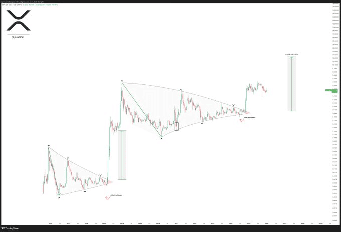 Wir sehen, wie Ripple mit seiner eigenen Geschichte spielt. Um Ihnen die Größenordnung zu verdeutlichen: XRP berührt exakt die gleiche Schwelle (die berühmte EMA von 21 Monaten), die es kurz vor dem Ausbruch im Jahr 2018 berührte und viele in die Höhe schickte. 🚀 Es ist, als würde der Markt einem Drehbuch folgen, das vor Jahren bereits geschrieben wurde, wobei ein riesiges Konsolidierungs-Dreieck gebrochen wird und nach dem Impuls sucht, der eine parabolische Trendentwicklung auslöst.