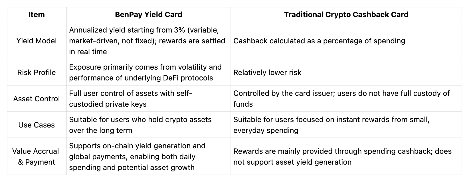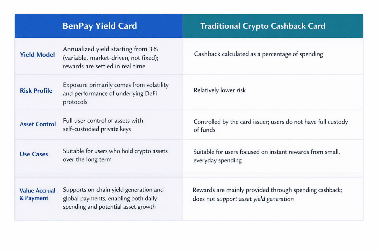 Wenn Sie größeren Wert auf Vermögenskontrolle, On-Chain-Transparenz und langfristiges Wachstum von Vermögenswerten legen, bieten Krypto-Ertragskarten – vertreten durch die BenPay Yield Card – eine geeignetere Wahl.