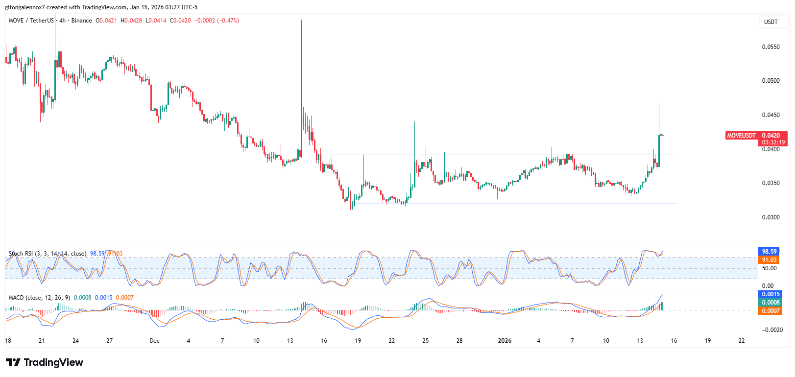 Auf der Preisgrafik ist zu sehen, dass MOVE den seit Mitte Dezember bestehenden Konsolidierungsbereich durchbrochen hat, wobei der Preis zwischen 0,0336 und 0,0400 US-Dollar schwankt. Verschiedene technische Indikatoren zeigen einen klaren Aufwärtstrend: MACD steigt stetig, der stochastische RSI zeigt, dass die Käufer den Markt dominieren.