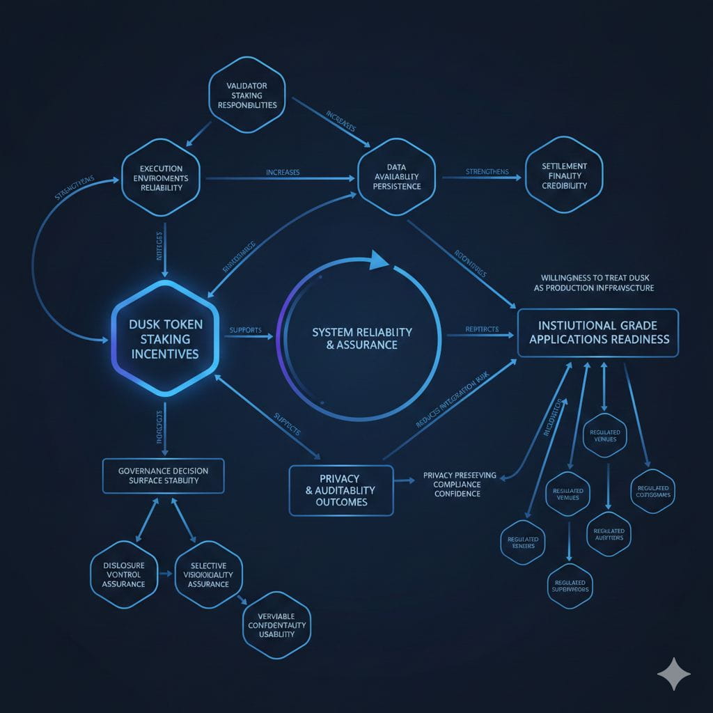 This is where the DUSK token becomes structurally important without being promotional. DUSK token staking incentives can fund a long horizon security budget that supports validator responsibilities, and those responsibilities underpin settlement finality and data availability that auditors and supervisors ultimately rely on. In the Permission Weave, the DUSK token is not a growth story, it is the economic mechanism that can either stabilize or destabilize institutional readiness. If staking incentives are aligned, validators have a reason to behave predictably, keep execution environments reliable, and preserve the integrity of privacy and auditability paths. If incentives are misaligned, institutions will perceive Dusk as an operational dependency with unpredictable failure modes.