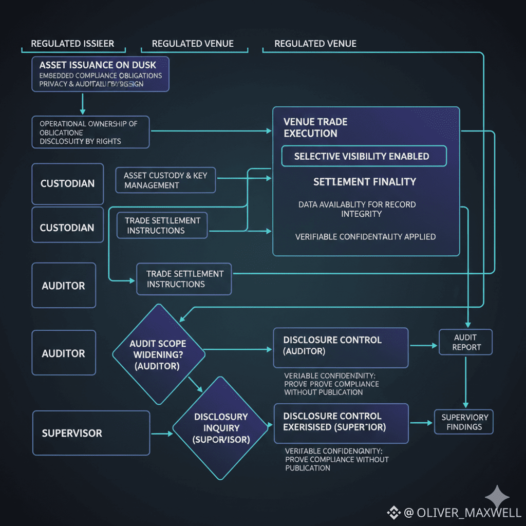 Move one step forward to distribution and secondary activity, where a regulated venue and a custodian become the center of gravity. On Dusk, the venue needs selective visibility that supports trade execution without leaking counterparty intent, and it needs settlement finality that is legible to post trade operations, not just to protocol engineers. The custodian needs disclosure control that maps cleanly onto operational ownership of keys and permissions, because custody is not only about holding assets, it is about controlling who can see what and when. If Dusk’s privacy model forces either party to maintain shadow books to reconstruct events, the Permission Weave breaks and compliance first financial infrastructure becomes a slogan rather than an operational reality.