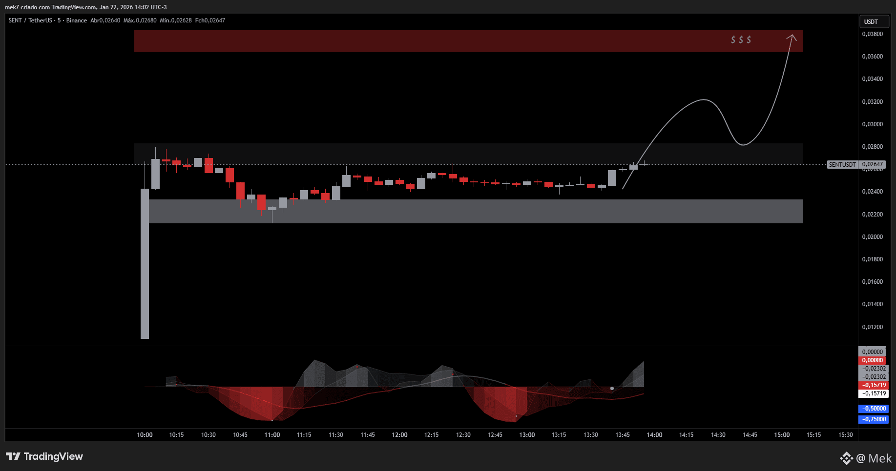 E aí, Traders. A $SENT token do ecossistema Sentient focado em IA e infraestrutura descentralizada, apresenta um setup interessante no gráfico de 5 minutos contra USDT, com o preço oscilando em torno de 0.02644 dólares após uma rejeição inicial.