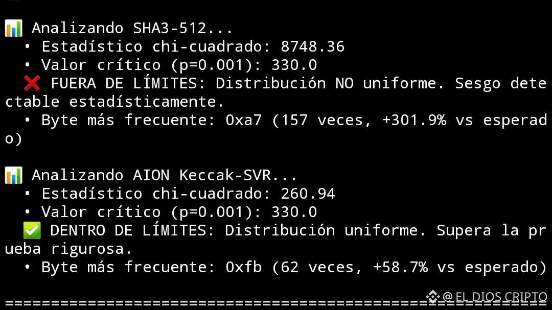 Meine Implementierung #AIONICA umfasst spezifische Modifikationen, die die interne Symmetrie von Keccak brechen. Unter denselben Testbedingungen, unter denen SHA3-512 Chi²=4,414 erzeugt, produziert AION Chi²=261—17-mal geringer und innerhalb des statistischen Uniformitätsgrenzwerts. Dies wird durch die Einspeisung von Blockzählern und zusätzlichen Transformationen erreicht, die den internen Zustand vor dem XOR der Absorption diversifizieren.